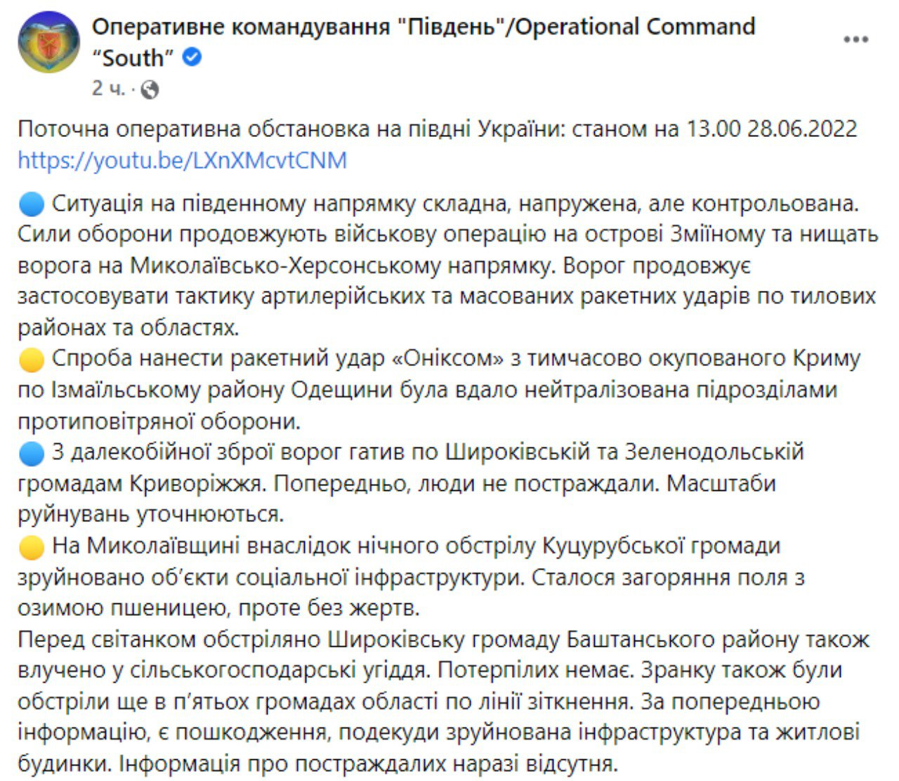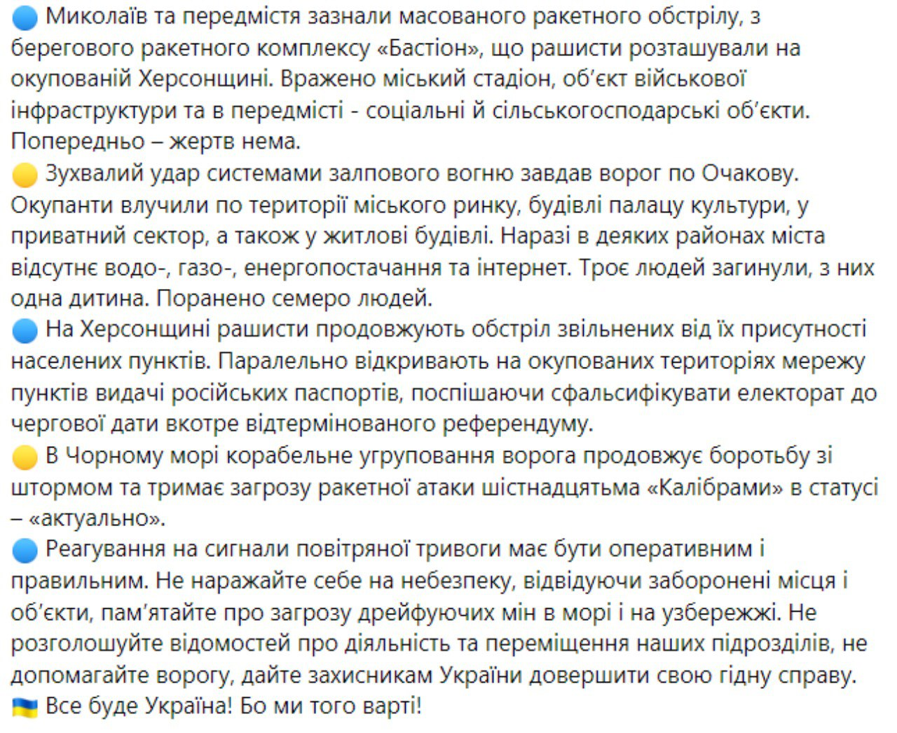 Новая сводка от оперативного командования "Юг". Фото: slovoidilo.ua