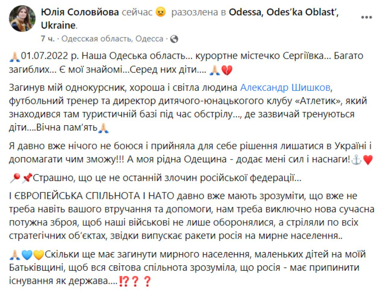 "Погиб мой однокурсник, хороший и светлый человек Александр Шишков, футбольный тренер и директор детского футбольного клуба "Атлетик", который находился там на туристической базе во время обстрела…, где обычно тренируются дети…. Вечная память", - написала Соловьева.
