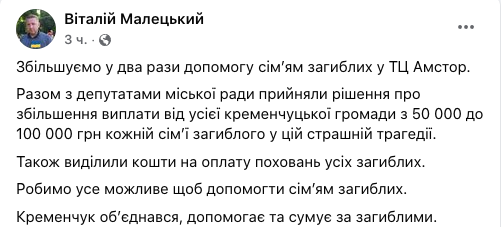"Делаем все возможное, чтобы помочь семьям погибших. Кременчуг объединился, помогает и скучает по погибшим", - пишет мэр.