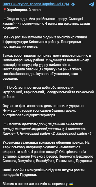 В целом в течение суток, по данным Областного центра экстренной медицинской помощи, вследствие обстрелов было четверо раненых: один в Харькове, два в Чугуевском районе и один в Харьковском районе.