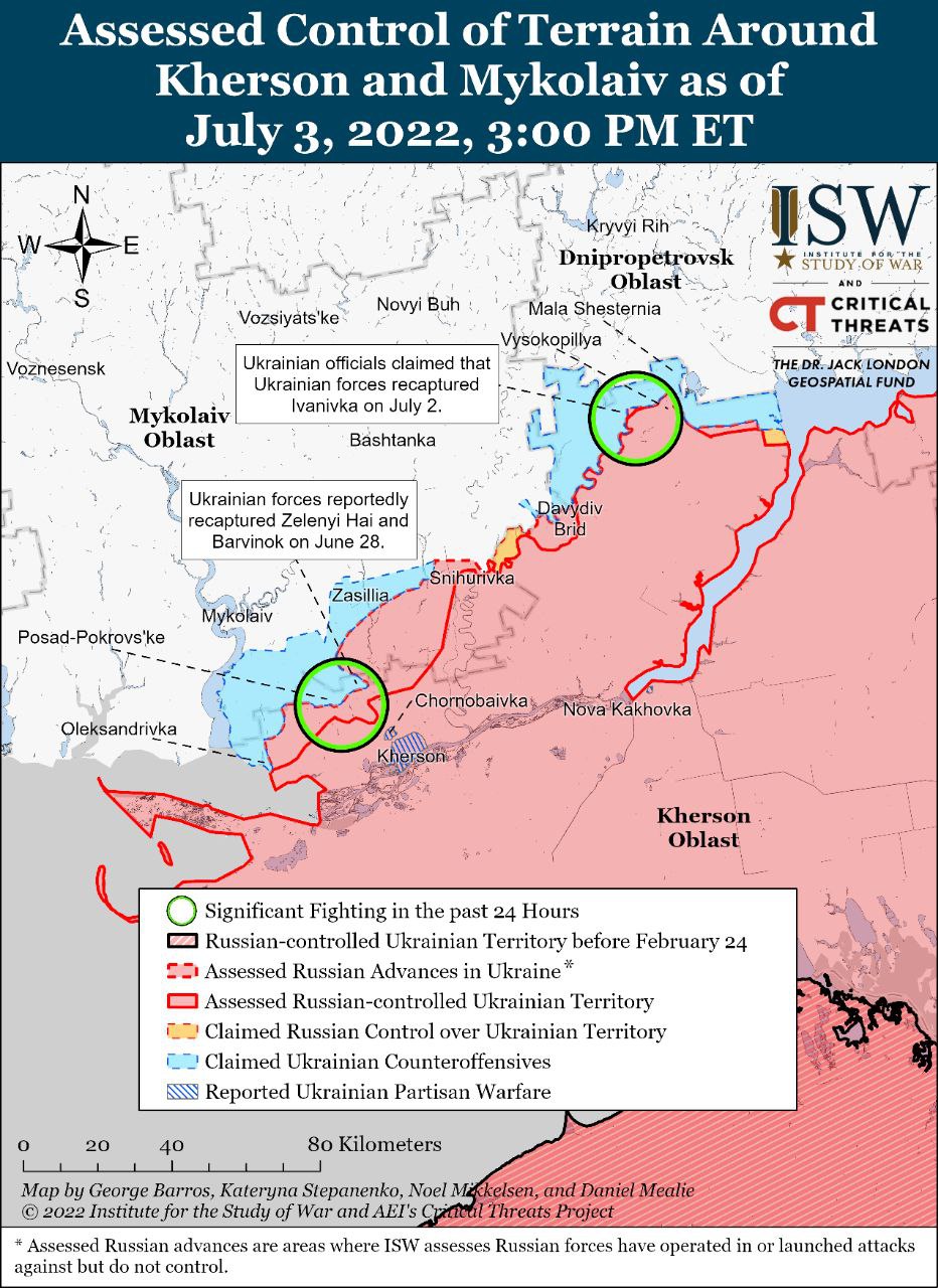 "Данные НАСА показали аномально большое количество пожаров вдоль линии фронта в Николаевской и Херсонской области 3 июля, особенно вблизи Снигуровки, Засилья, Копани-Зеленый Гай и Таврического. Эти места являются вероятными базами для возможного украинского контрнаступления", - говорится в отчёте Института.
