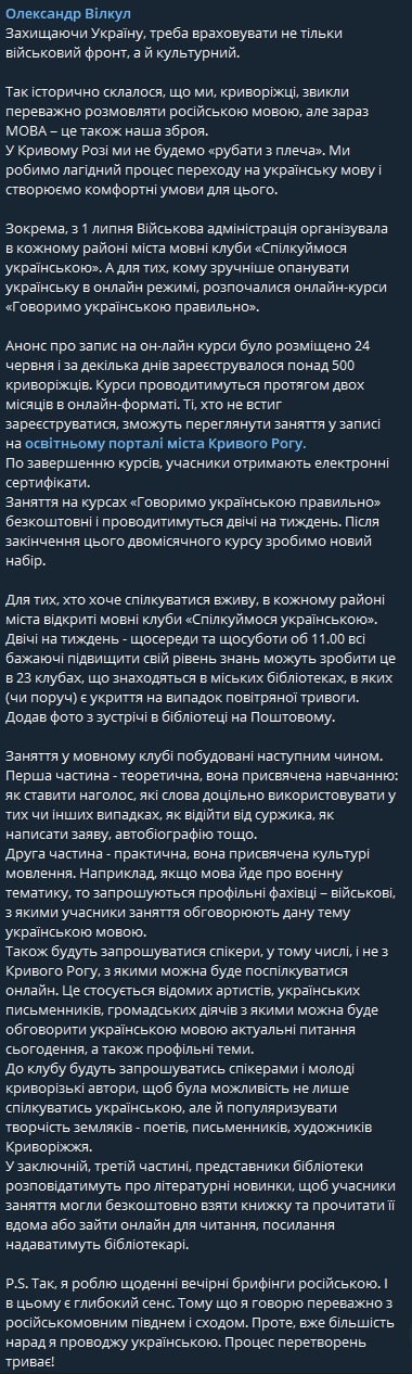 Он заявил, что с 1 июля в Кривом Роге открылись клубы "общаемся по-украински", и онлайн-курсы "говорим по-украински правильно".