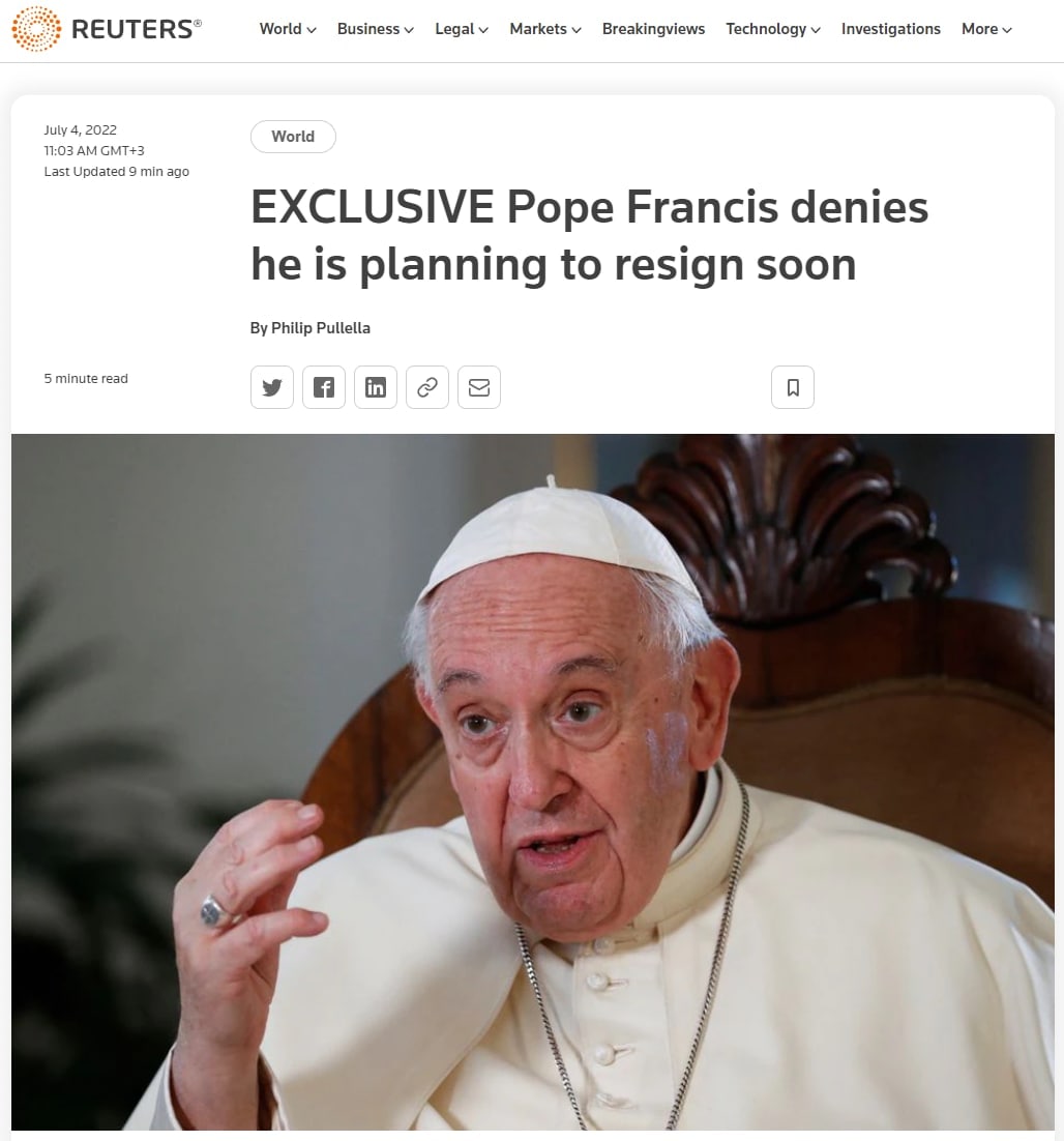 11:27 Папа римский Франциск заявил, что хотел бы посетить Москву и Киев, пишет Reuters.