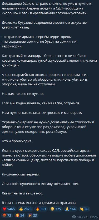 4. "Ситуация на фронтах за сутки не изменилась. Противник продолжает терроризировать пограничные районы Сумской области, Харьков и района области, Донбасс. ВСУ отвечают, уничтожая их военный потенциал. Нам нужно переломить их".