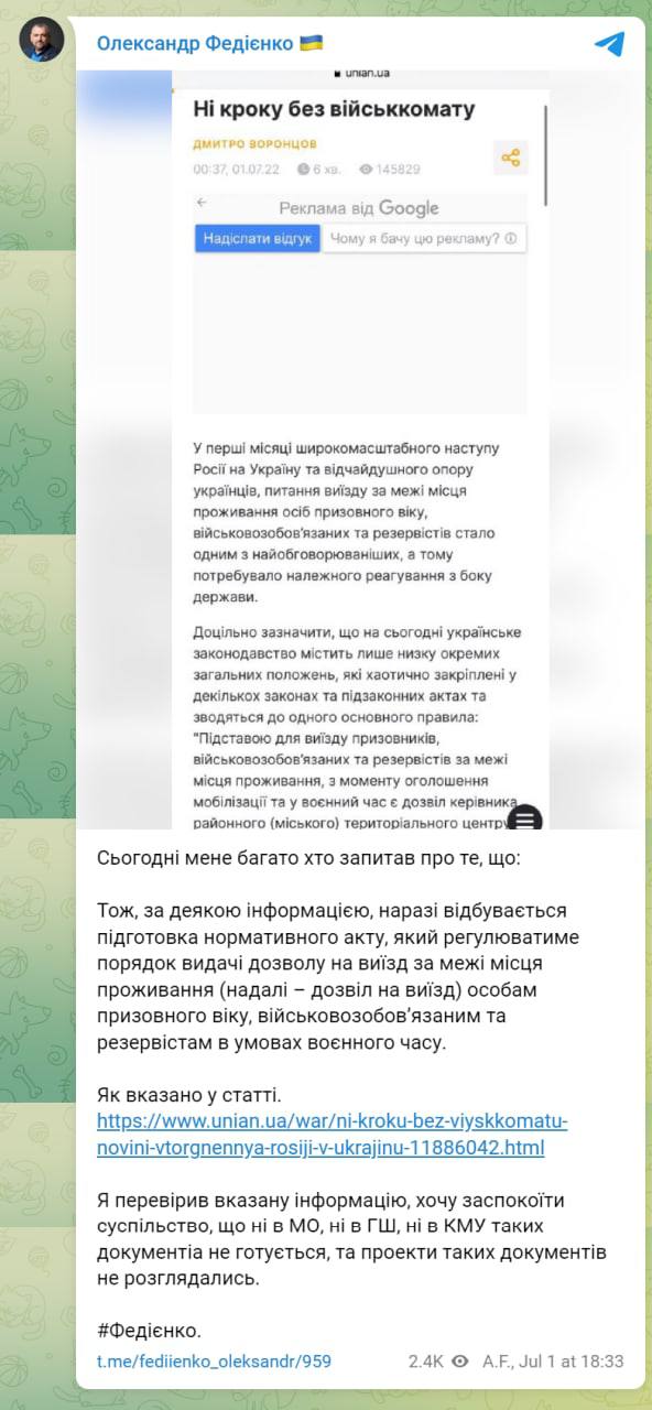 22.53 Сегодня многие телеграмм-каналы написали, что нардеп Александр Федиенко опроверг сообщение Запорожской ОВА о том, что военнообязанные не имеют права покидать место проживания без разрешения военкомата.