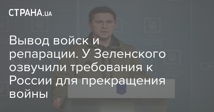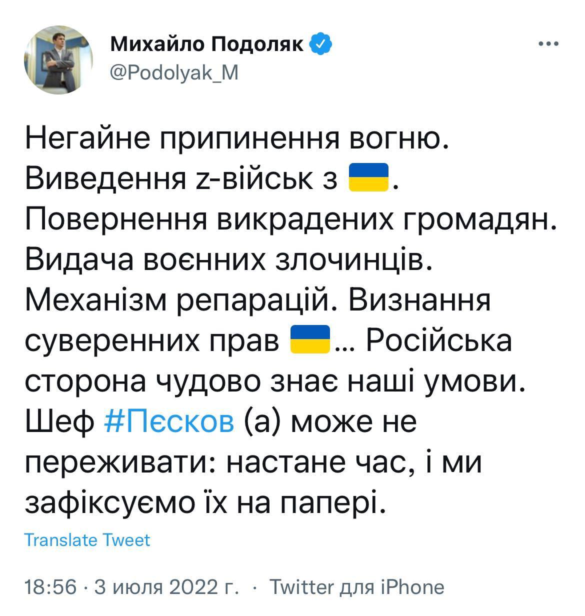 Советник главы Офиса президента Украины Михаил Подоляк в ответ на заявление пресс-секретаря российского президента, что Украине придется "понять ещё раз все наши условия", опубликовал украинские требования к России.