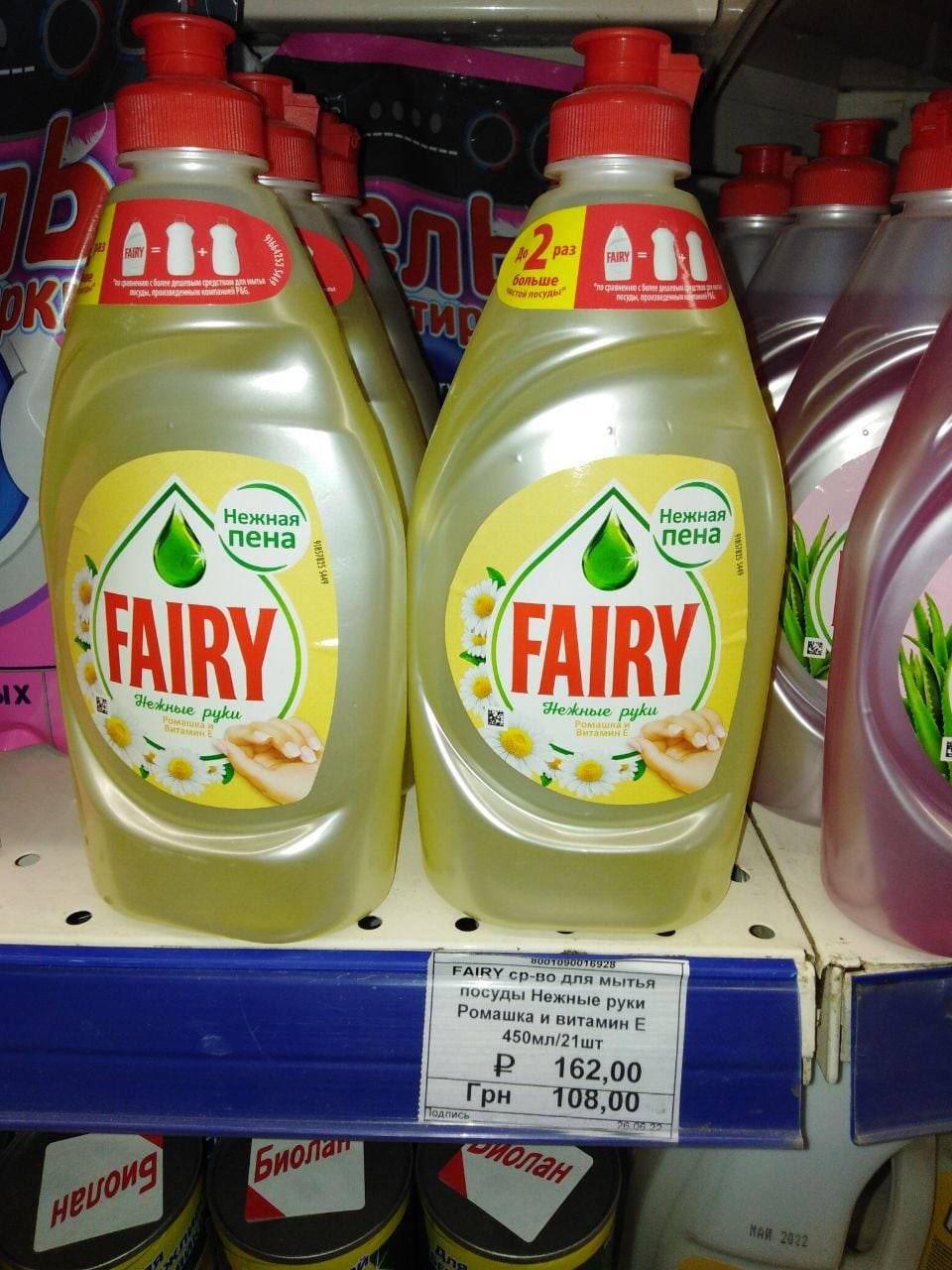 Так, моющее средство Fairy "нежные руки" стоит 108 грн (в Киеве - 60 грн), шампунь Shauma стоит в Мариуполе 185 грн (в Киеве такой - 108), набор губок для посуды - 71 грн (в Киеве - 38).