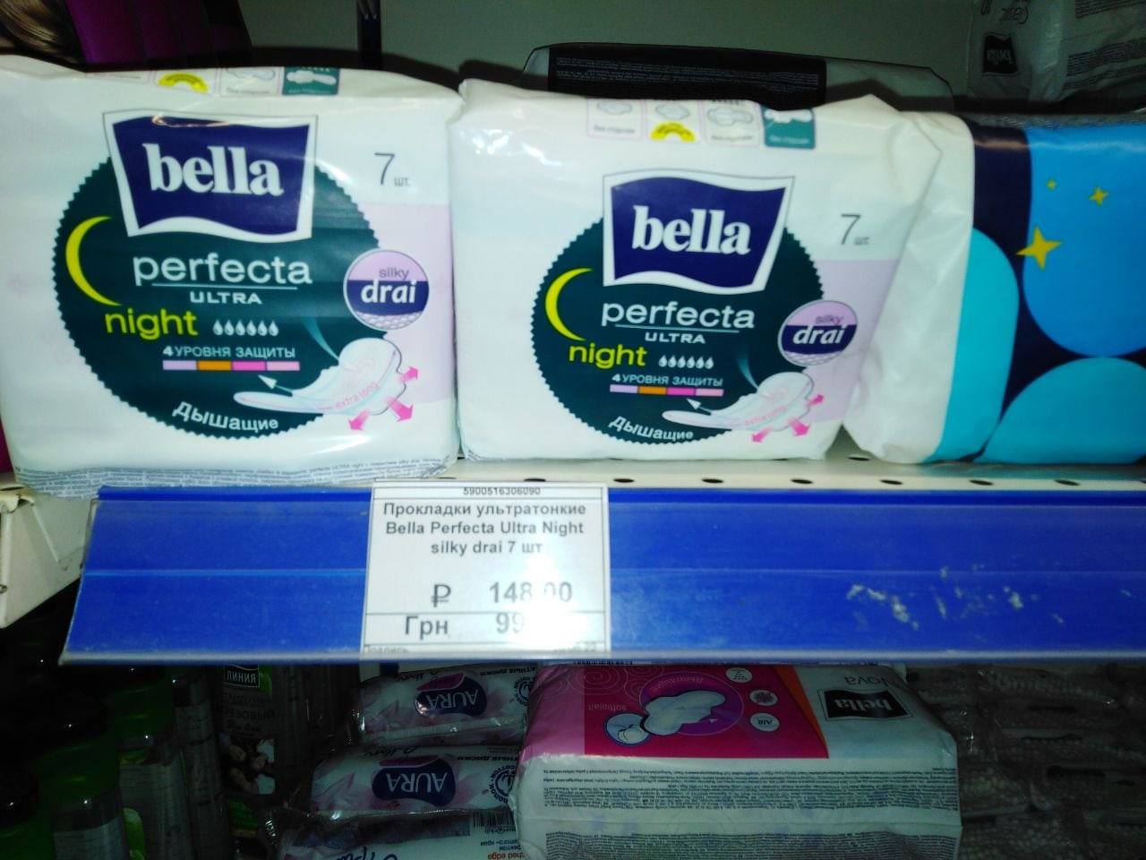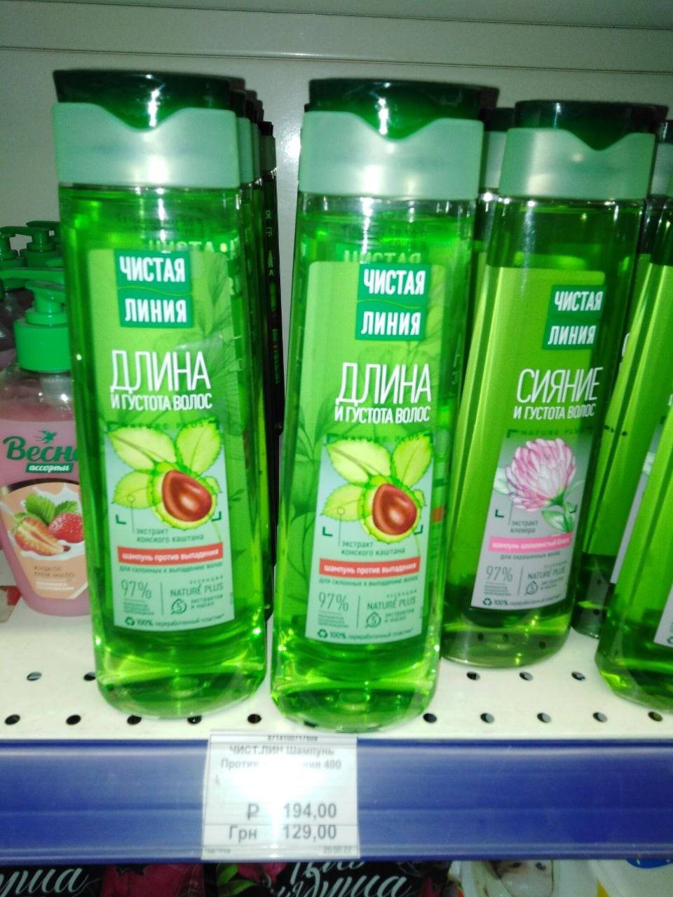 Шампунь "Чистая линия", который продают за 128 грн в Мариуполе, в Киеве можно купить по цене до 118 грн в зависимости от ингредиентов, упаковку прокладок, которая стоит 99 грн в Мариуполе, в Киеве можно найти за 50 грн.