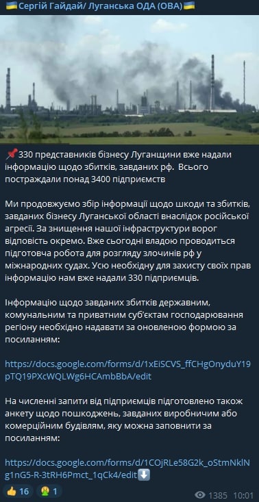 Также Гайдай опубликовал ссылку на анкету, с помощью которой предприниматели могут передать данные о повреждениях.