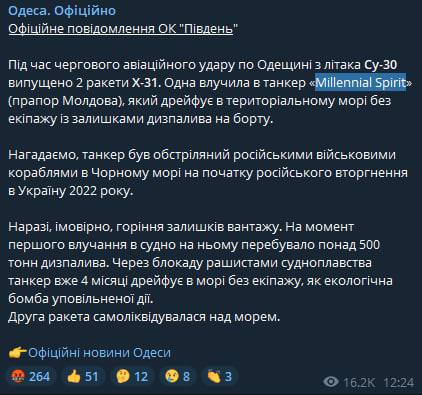 13:15 В Одесской области Россия выпустила 2 ракеты Х-31 с самолета Су-30, одна из них попала в танкер "Millennial Spirit" под флагом Молдовы, который дрейфовал без экипажа с остатками дизтоплива на борту после обстрела в начале вторжения.