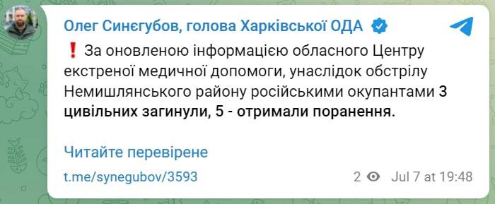 Предварительно - обошлось без пострадавших, сообщил глава Харьковской ОГА Олег Синегубов.