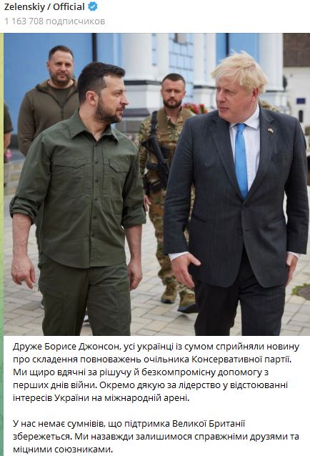 1. "Главная тема дня - британская. Решение Бориса Джонсона об отставке. Я говорил с ним, поблагодарил за поддержку. Украины чувствуют особую благодарность Джонсону. Но отношение Британии к Украине не должно измениться, и меня в этом заверили".
