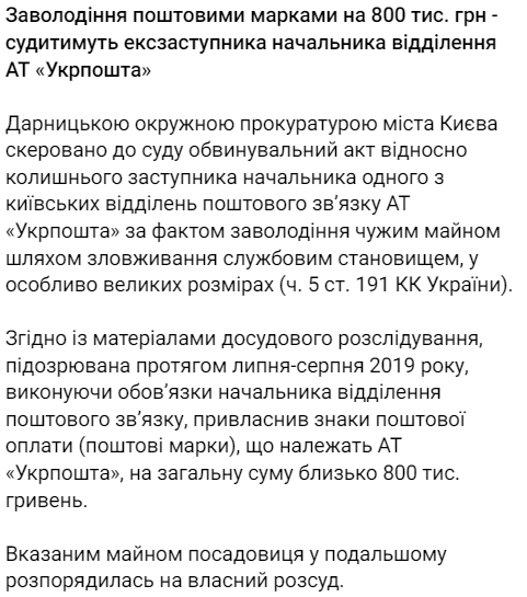 Бывший заместитель начальника одного из отделений "Укрпочты" в Киеве завладел марками на 800 тысяч гривен.