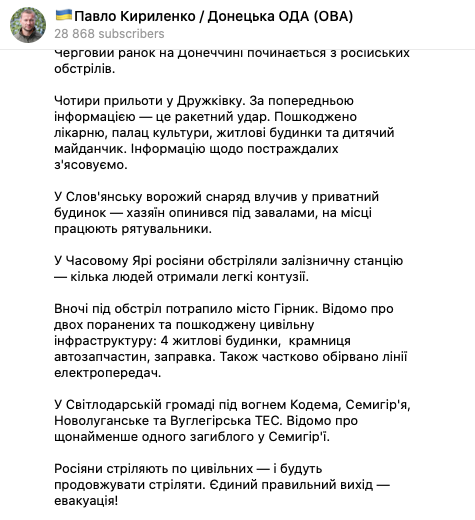 "Четыре прилета в Дружковку. По предварительной информации, это ракетный удар. Повреждена больница, дворец культуры, жилые дома и детская площадка. Информацию о пострадавших выясняем", - рассказал он.