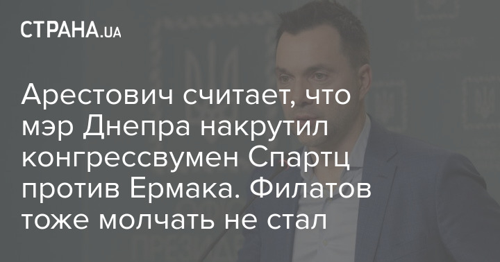 Советник главы Офиса президента Алексей Арестович обвинил мэра Днепра Бориса Филатова и лидера "Нацкорпуса" Андрея Билецкого в том, что это они "накрутили" против Андрея Ермака члена Палаты представителей Конгресса США Викторию Спартц.