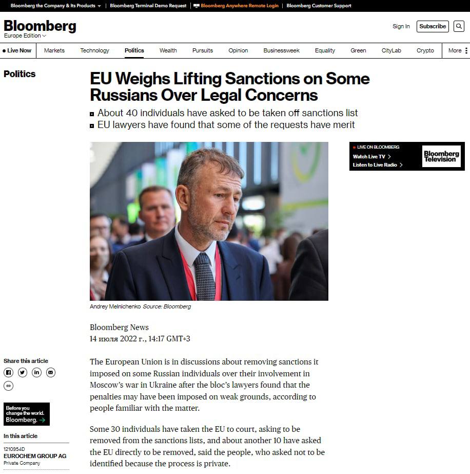 "Тем не менее, новые оценки будут касаться небольшой доли целевых лиц. С начала войны в феврале ЕС подверг санкциям сотни людей, в том числе десятки магнатов, бизнесменов, политиков и военных", - пишет Bloomberg.