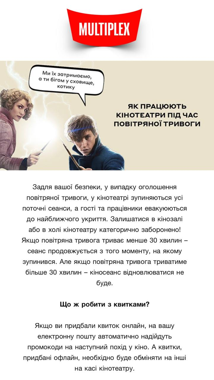 Сообщается, что если звучит воздушная тревога, сеанс тут же прерывается, оставаться в зале нельзя,