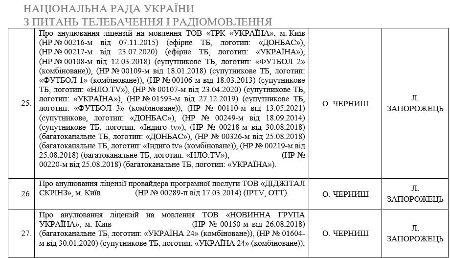 В повестке дня заседания Нацсовета, которое начнется в 11:00 сегодня - аннулирование лицензий телеканалов "Украина", "Украина24", "Донбасс", "Футбол 1/2/3", НЛО, Индиго.