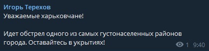 "Идет обстрел одного из самых густонаселенных районов города. Оставайтесь в укрытиях!", - написал он.