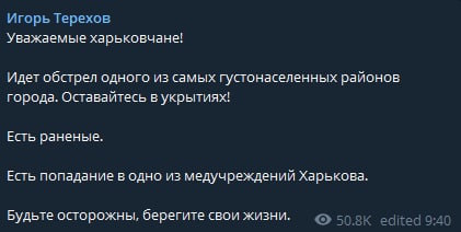 09:47 В Харькове обстрел, сообщил мэр города Игорь Терехов.