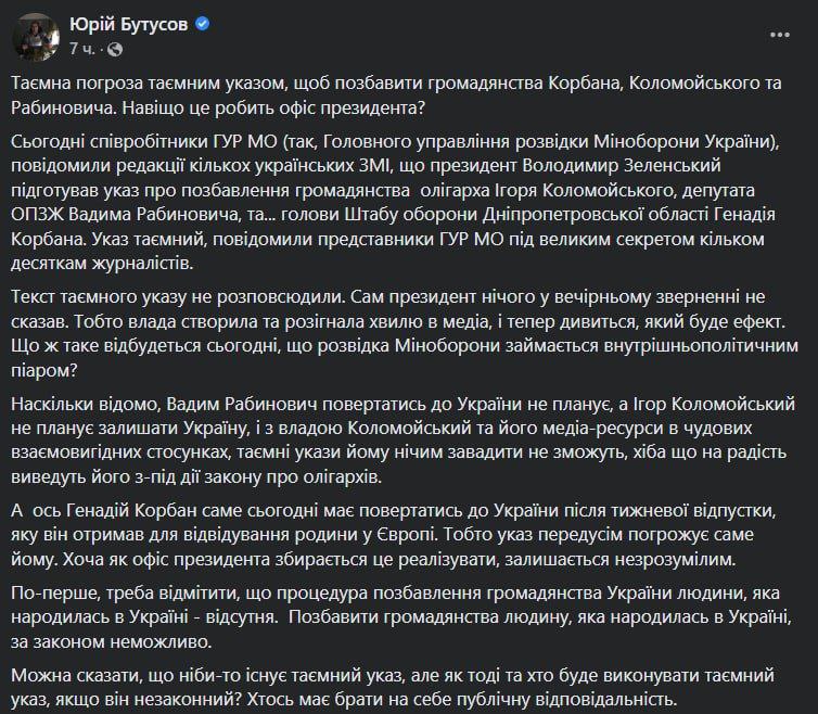 "Анонс указа можно воспринять как угрозу, чтобы Корбан, друг Филатова, не возвращался в Украину и добровольно остался за границей. И тогда следов тайного указа может не остаться", - предположил Бутусов.
