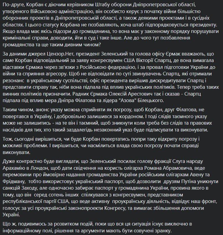 Также ширятся слухи о том, что Зеленский якобы дал указание не допускать Корбана на его рабочее место в штабе теробороны Днепра. Об этом заявил политтехнолог Дмитрий Касьянов.