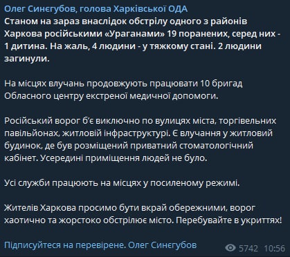6. "Обстрелян Салтовский район Харькова, известно о трех погибших. Били по Славянску и Краматорску".