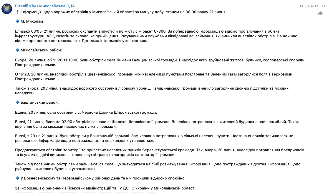 Также Ким дает информацию о вчерашних обстрелах всей Николаевской области: