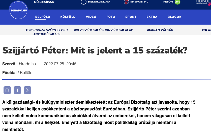 "Что значит, потребление газа в Европе нужно сократить на 15%? Каждая страна должна сократить на столько? Всем ли нужно на 15% меньше? Для промышленных потребителей? Для домовладельцев? Или кто-нибудь скажет вам, что 15% означают, что мы можем использовать гораздо меньше электроэнергии, гораздо меньше отопления, гораздо меньше энергии для приготовления пищи? Чем это обернется?", - говорит Сийярто.