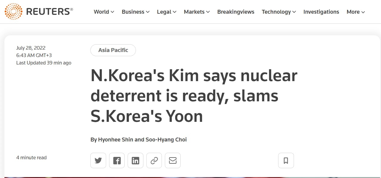 "Наши вооруженные силы полностью готовы к реагированию на любой кризис, и наша национальная система сдерживания ядерной войны также полностью готова верно, точно и быстро мобилизовать свои абсолютные силы для выполнения своей миссии", — сказал Ким.