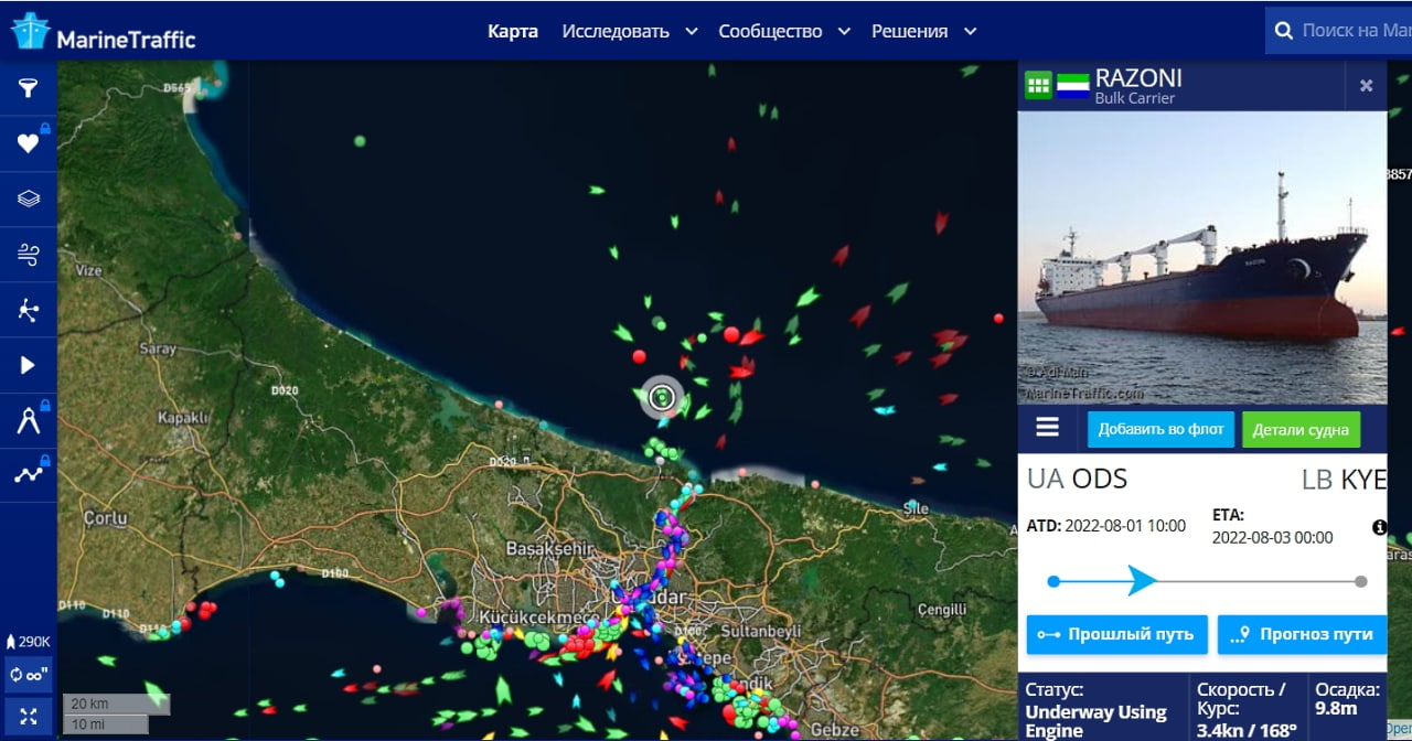 19:05 Судно Razoni вошло в территориальные воды Турции, показывает Marine Traffic.