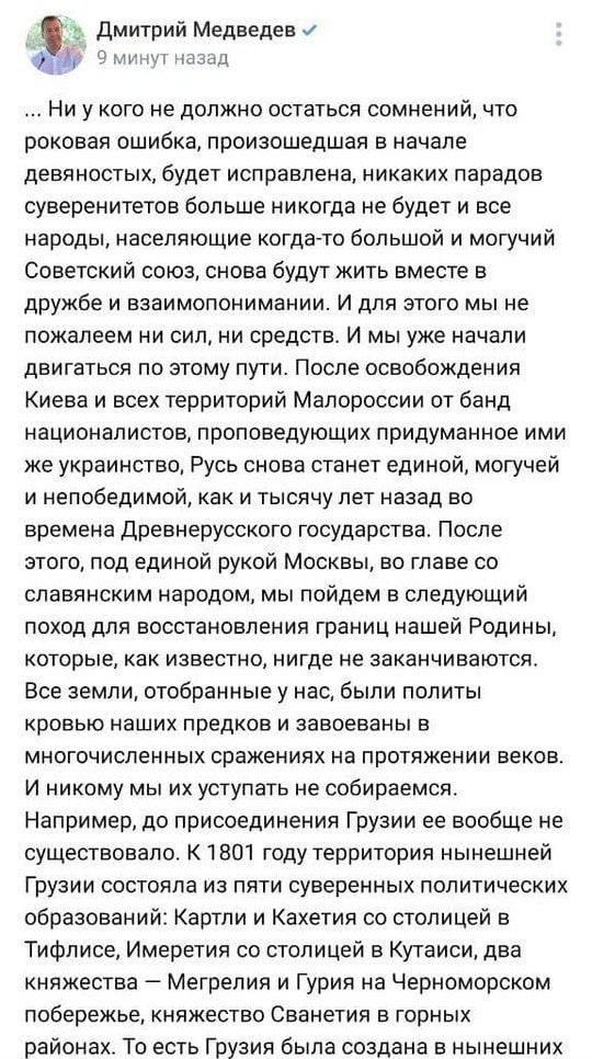 Спустя время помощник замглавы Совбеза РФ заявил, что данный пост - фейк и результат взлома страницы Медведева.