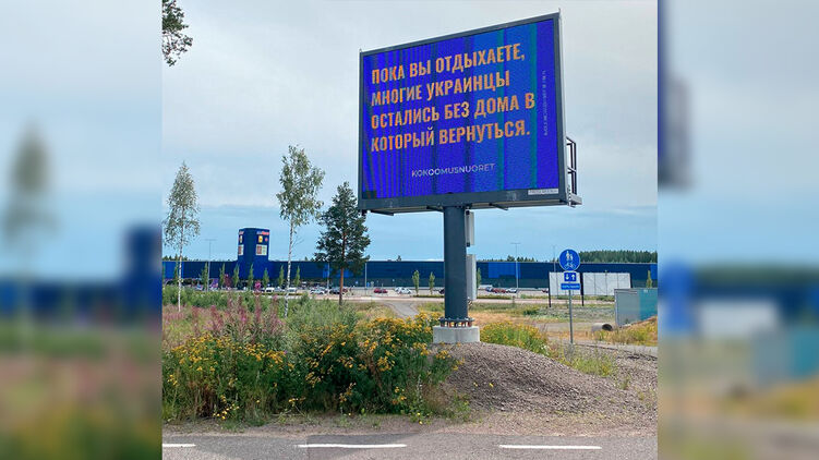 "Пока вы отдыхаете, многие украинцы остались без дома в который вернуться", - гласит надпись, не лишенная легкого финского акцента.