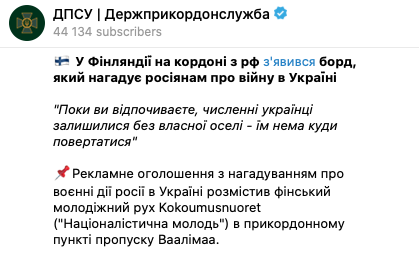 Его разместило финское движение "Националистическая молодежь" (Kokoumusnuoret) на пункте пропуска Ваалимаа, фото публикует украинская Госпогранслужба.