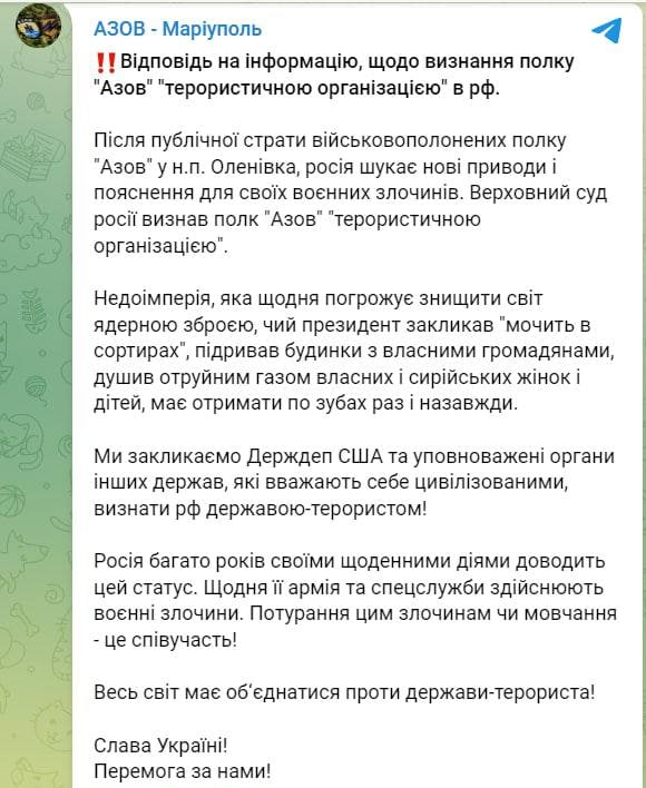 "После публичной казни военнопленных полка "Азов" в н.п. Еленовка, Россия ищет новые поводы и объяснения для своих военных преступлений. Верховный суд России признал полк "Азов" "террористической организацией".