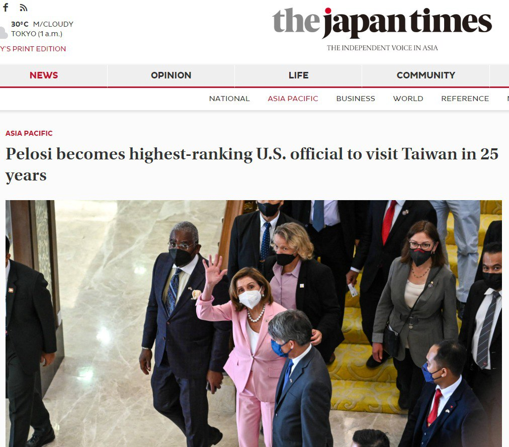 Министерство иностранных дел Китая выразило решительный протест из-за визита Пелоси на Тайвань и осудило его. Также в китайском ведомстве завили, что визит Пелоси на Тайвань серьезно нарушает принцип "одного Китая" и положения трех китайско-американских коммюнике.