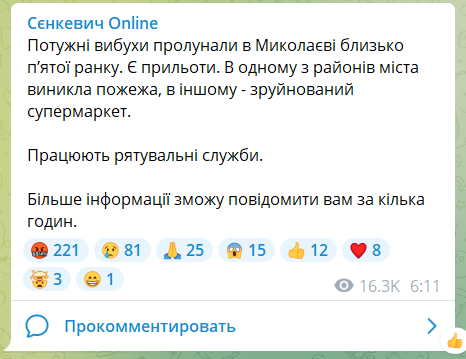 Ранним утром войска РФ снова нанесли удар по Николаеву. В одном из районов города возник пожар, в другом - разрушен супермаркет.