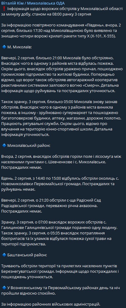 Николаев в ночь на 3 августа обстреляли дважды - в 21:00 и в 05:00. Из-за обстрелов поврежден причал, промышленное предприятие, жилые дома, гаражный кооператив, супермаркет и аптека, после обстрела начался пожар и были слышны мощные взрывы. Известно о попадании в конно-спортивную школу.