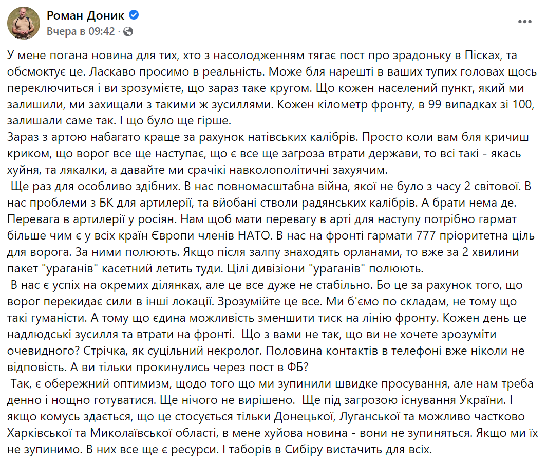 "Преимущество в артиллерии у россиян. Нам, чтобы иметь преимущество в арте для наступления, нужно орудий больше, чем есть у всех стран Европы членов НАТО. У нас на фронте пушки 777 приоритетная цель для врага. За ними охотятся. Если после залпа находят "Орланами", то уже через 2 минуты пакет "ураганов" кассетный летит туда. Целые дивизионы "ураганов" охотятся. У нас есть успех на отдельных участках, но это все очень нестабильно", - пишет Доник.