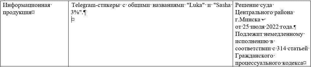 В документе говорится, что Telegram-стикеры с названиями "Luka" и "Sasha 3%" по решению суда Центрального района Минска 25 июля были признаны экстремистской информационной продукцией.