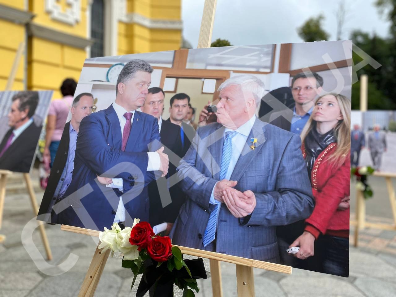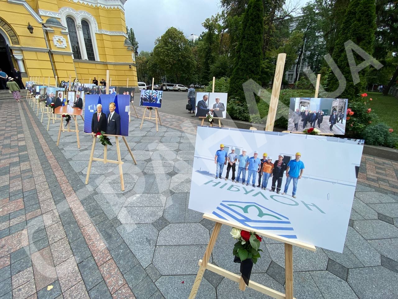 У входа во Владимирский собор поставили фотографии агробизнесмена с известными личностями. Есть фото с президентами Украины, Кучмой, Ющенко и Порошенко. С Зеленским фотографии нет.