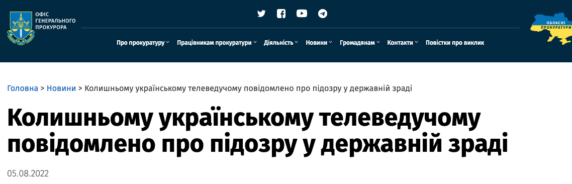 Офис генпрокурора сообщил о подозрении в госизмене бывшему украинскому телеведущему. Его фамилия не сообщается, но, судя по фото, речь идет о Юрие Коте.