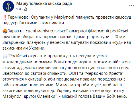 "Обращаюсь к мировому сообществу, ООН и "Красному Кресту" с просьбой вмешаться в ситуацию, чтобы работали правила обращения с военными пленными. Мы должны сделать все, чтобы наши защитники вернулись в Украину живыми и не допустить в Мариуполе второй Еленовки", - пишет городской голова Вадим Бойченко.