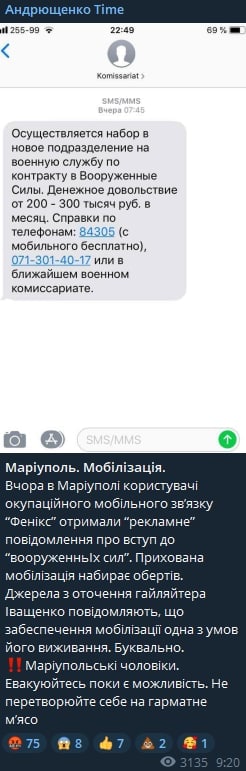 Жителям захваченного Мариуполя рассылают смс с рекламой военной службы за 300 000 рублей в месяц