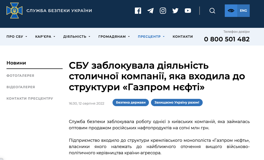 СБУ заявляет, что заблокировала деятельность киевской компании из структуры "Газпром нефти", которая занималась оптовой продажей российских нефтепродуктов.