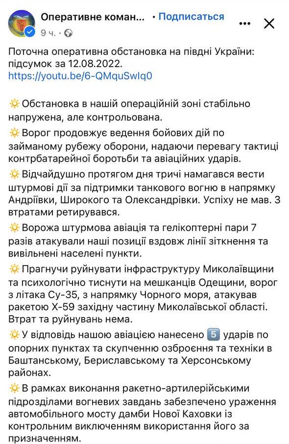 Оперативное командование "Юг" сообщает, что ВСУ нанесли удар по автомобильному мосту на дамбе в Новой Каховке.