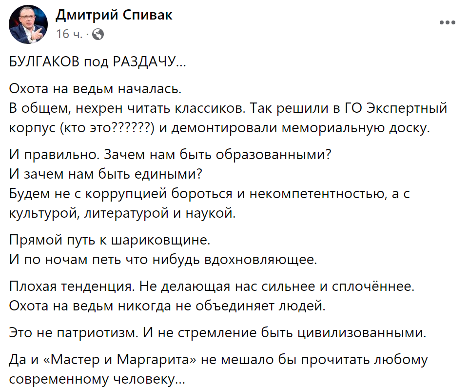 Другие украинцы восприняли историю со сносом таблички с Булгаковым однозначно негативно.