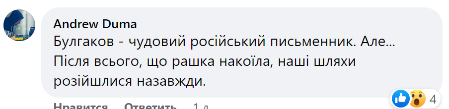 "Булгаков – замечательный русский писатель. Но... После всего, что решка натворила, наши пути разошлись навсегда", - написал киевский айтишник Андрей Дума.