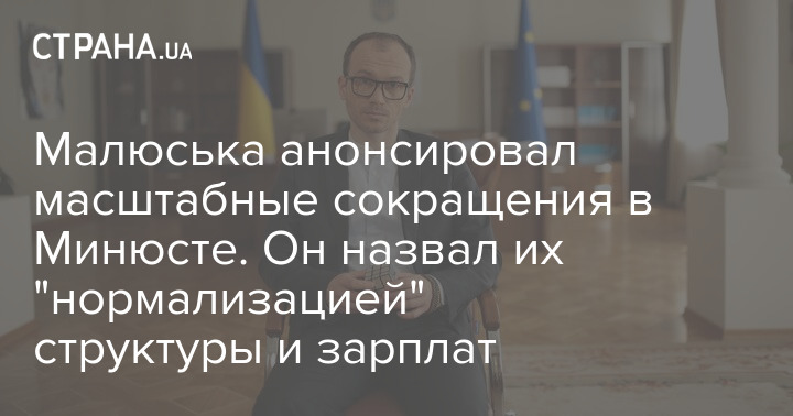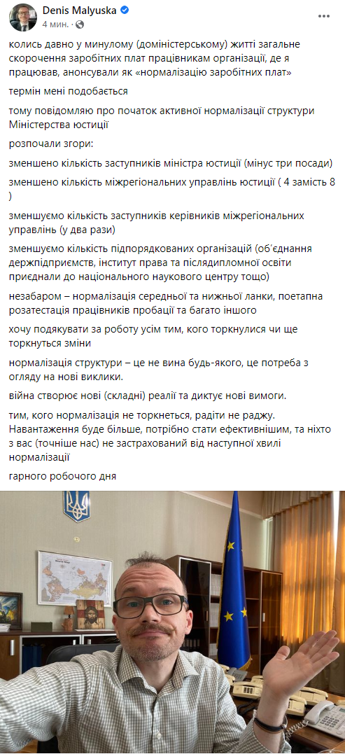 Глава Минюста Украины Денис Малюська анонсировал масштабные сокращения в структуре государственного ведомства. Об этом он написал у себя в Facebook, обозначив процесс термином "нормализация заработных плат".