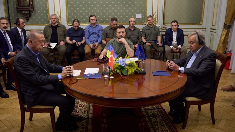 Ранее Зеленский подвел итоги переговоров во Львове с Эрдоганом и Гутерришем. Упомянул визит миссии МАГАТЭ на Запорожскую АЭС, украинских военнопленных, готовность Турции взять под патронат восстановление Харькова и области и свой призыв к Эрдогану и Гутерришу быть максимально жесткими в отношении псевдореферендумов, которые готовит Россия на оккупированных территориях.